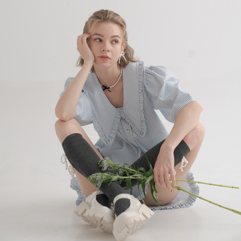 原创设计条纹荷叶娃娃领短袖JIAXINXU原创独立设计师品牌21春夏新热门设计联盟服务商