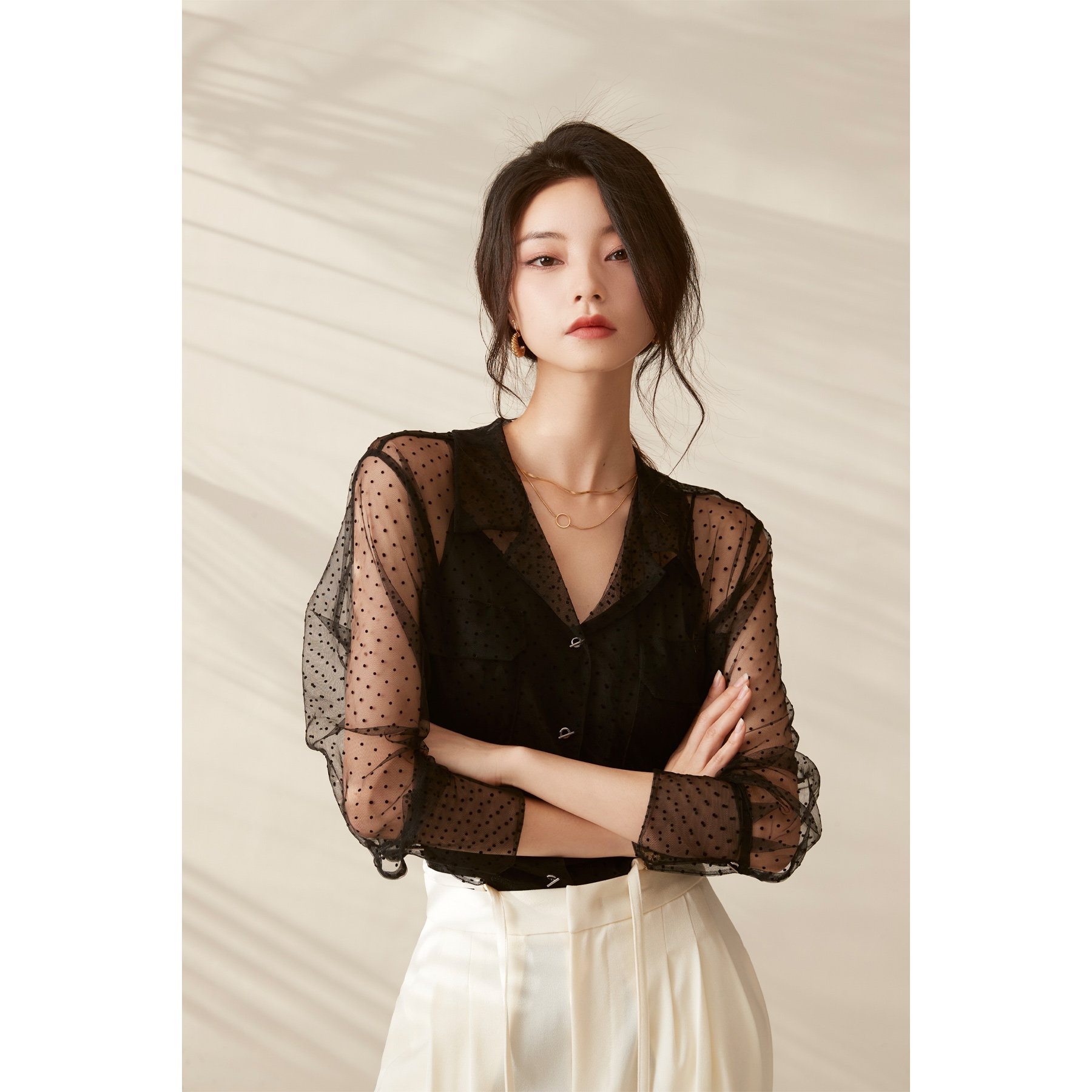 AS幻缈仙境原创仙女巴黎纱黑色波点网纱衬衫女气质新款薄款上衣夏热门设计联盟服务商