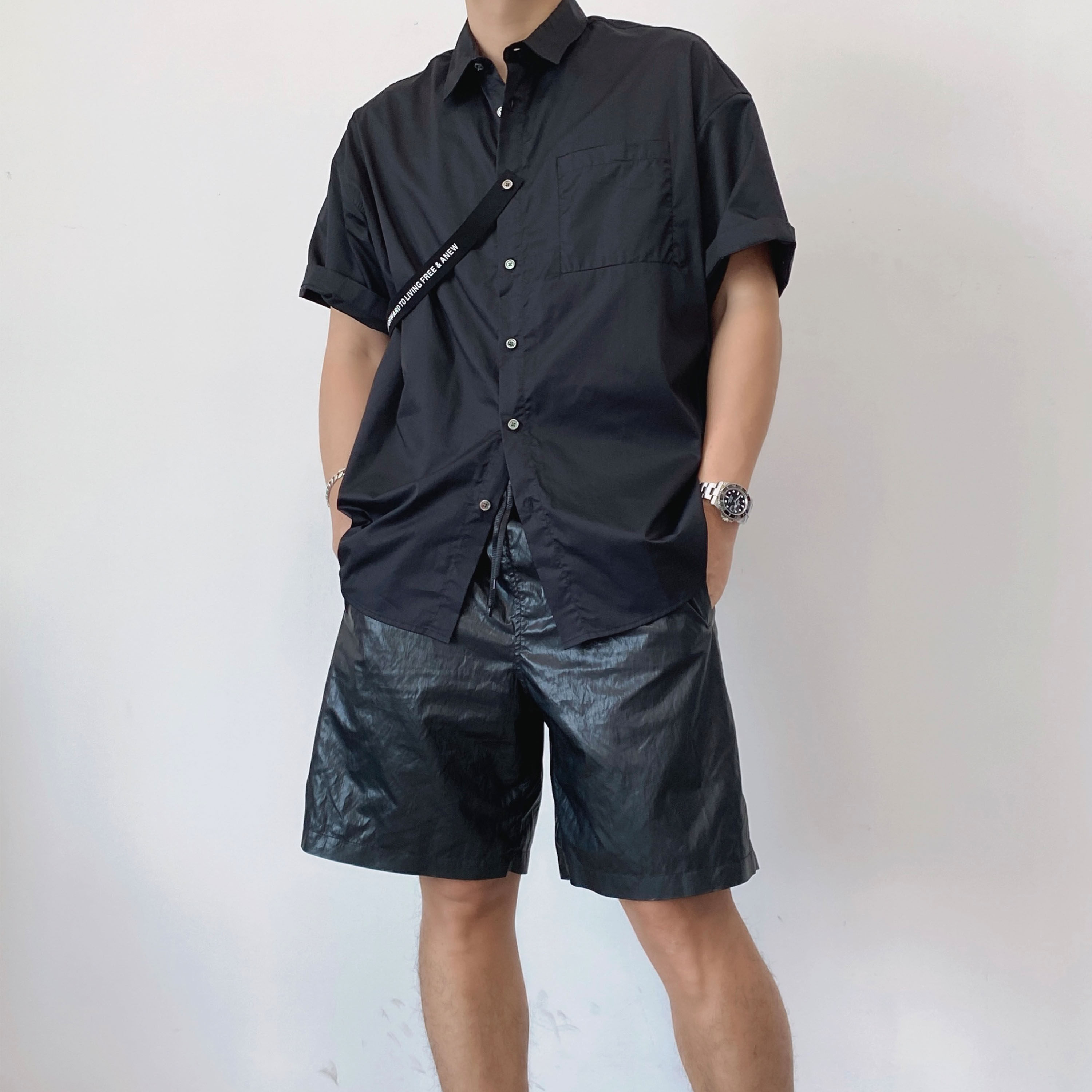 港风设计感纯色衬衣休闲潮轻熟风小众高级感上衣宽松短袖衬衫男热门设计联盟服务商