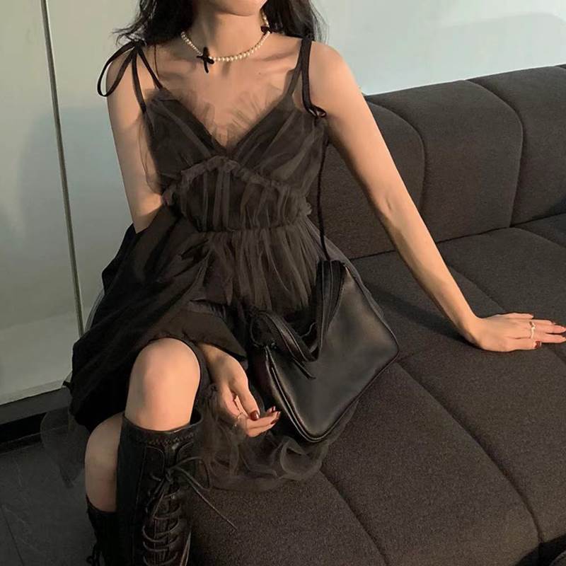 法式网纱黑色吊带连衣裙女夏纱裙海边度假沙滩仙女别致设计感裙子热门设计联盟服务商