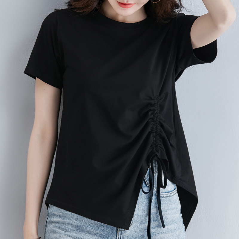 短袖t恤女夏韩版纯棉宽松港风抽绳个性不规则设计感上衣ins潮开叉热门设计联盟服务商