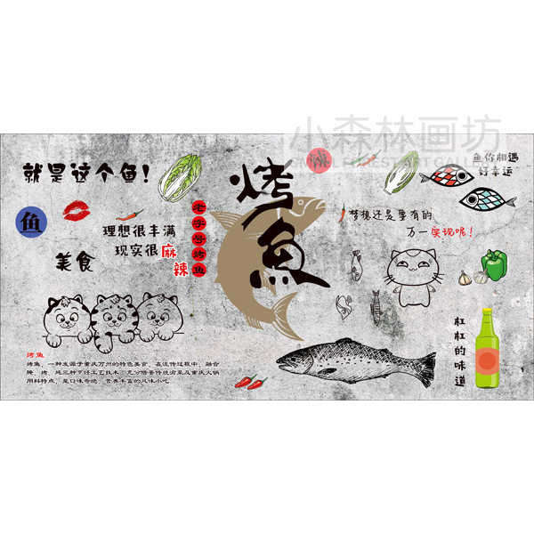 个性创意海鲜烧烤烤鱼店 墙面装饰墙壁画饭店背景墙装修贴画海报热门设计联盟服务商